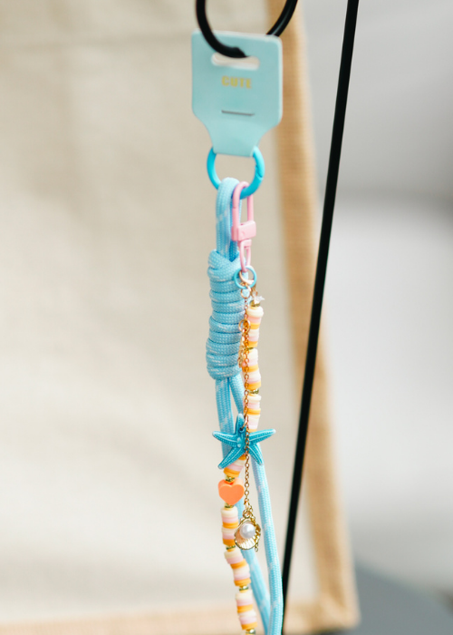 Évite l'eau : Même si les mousquetons sont en acier inoxydable, évite le contact prolongé avec l'eau (douche, baignade en mer ou en piscine) pour préserver la brillance des perles et des breloques.